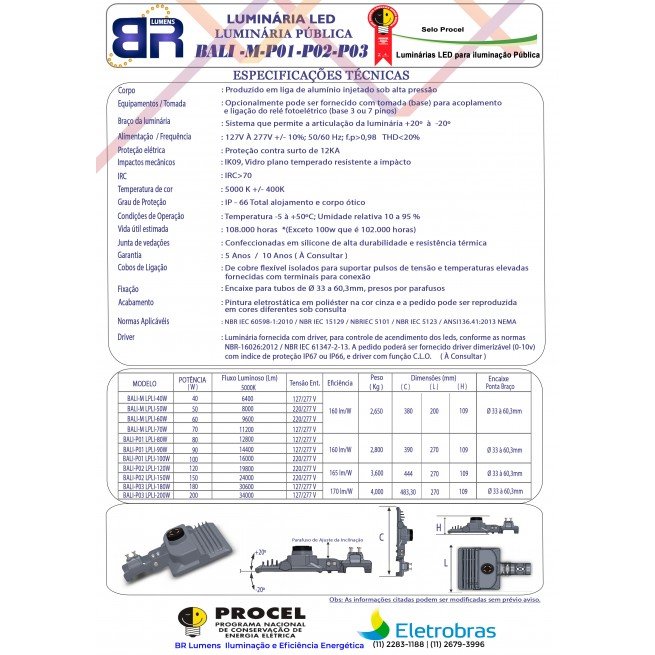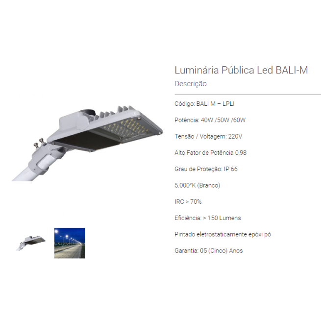 Código: BALI M – LPLI Potência: 40W /50W /60W Tensão / Voltagem: 220V Alto Fator de Potência 0,98 Grau de Proteção: IP 66 5.000°K (Branco) IRC > 70% Eficiência: > 150 Lumens Pintado eletrostaticamente epóxi pó Garantia: 05 (Cinco) Anos Assistência Técnica Estudos Luminotécnicos Leds: Cree / Lumileds Driver: Philips Possuem compartimento para utilização de base relê tradicional 3 pinos ou modelo Nema 7 pinos. (Informamos que as luminárias HGE atendem a Norma ABNT Portarias INMETRO Nº 118 de 06/03/2015 e Nº 20 de 15/02/2017.)